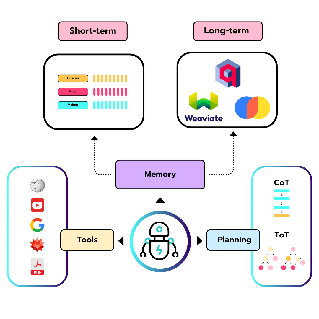 On peut voir le LLM comme un cerveau dans un bocal : très puissant, capable d’enchaîner les pensées, mais isolé. Pour qu’il devienne un agent, il faut lui donner des moyens d’agir et de se souvenir.